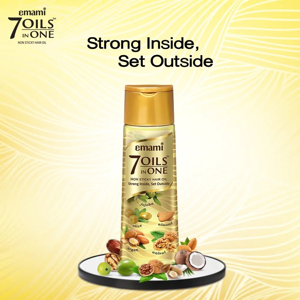 Introducing Emami 7 Oils in One Non Sticky Hair Oil, a revolutionary product designed for damage control. Formulated after extensive research, this unique blend of seven oils is specially crafted to reverse hair damage and restore its vitality. Packed with essential vitamins such as A, B, D, and E, as well as rich minerals and proteins, this oil not only repairs but also reconditions and softens your hair. Developed in collaboration with both Indian and International Hair Experts, this oil provides exceptional nourishment without leaving your hair feeling heavy. With its delightful fragrance, it suits all hair types, offering a luxurious experience with every use.