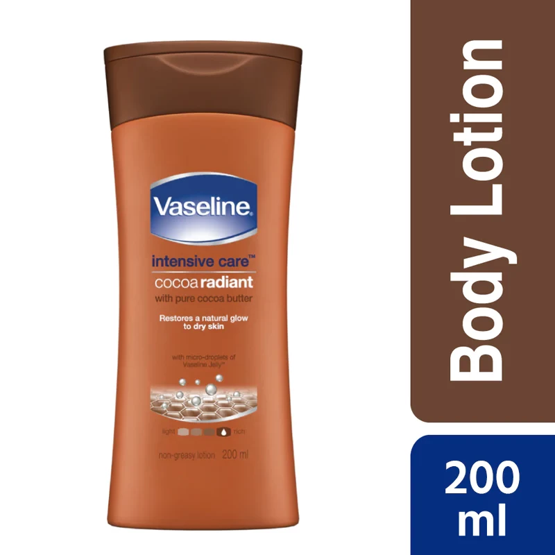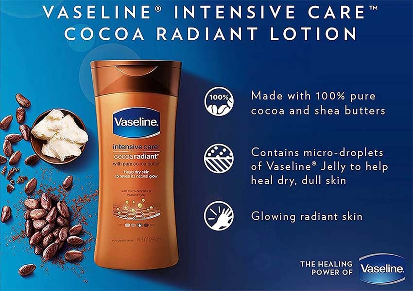 Deeply nourish and reveal your skin's natural glow with Vaseline Intensive Care Cocoa Radiant Body Lotion. This rich, fast-absorbing formula is packed with 100% pure cocoa butter and micro-droplets of Vaseline Jelly to lock in moisture for 48 hours. It helps to deeply moisturize dry skin, restore dry, dull-looking skin, reveal a healthy-looking, radiant glow, soothe and comfort dry skin.